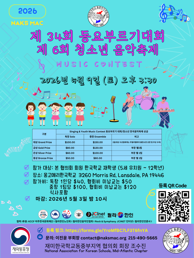 재미한국학교 동중부지역협의회 주최 제34회 동요부르기 대회 일시: 2026년 5월 9일 (토요일) 오후 3시 30분 -오후 7시 장소: 몽고메리한국학교 3260 Morris Rd. Lansdale PA 19446 참가 대상: 본 협의회 회원 한국학교 재학생 (5세 유치원 ~ 5학년) 참가비: 독창 1인당 $40, 협회비 미납교는 $50; 중창 1팀당 $100, 협회비 미납교는 $120 식사포함 <참가 부문 및 자격> 독창: 한국에서...