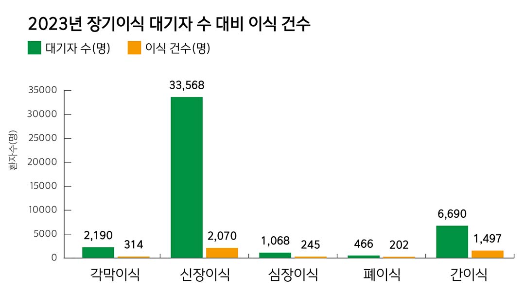 국내 장기이식 대기자는 2023년 말 기준 5만 1,857명이다. 이들 중 각막이식 대기자는 2,190명, 신장 3만 3,568명, 심장 1,068명, 폐 466명, 간 6,690명 등으로 나타났다.