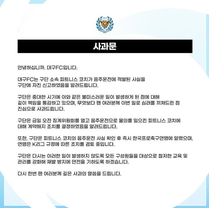 프로축구 K리그를 총괄하는 한국프로축구연맹은 제17차 상벌위원회를 열어 K리그1 대구FC 피지컬코치 A씨에 대한 14경기 출장정지와 제재금 400만원의 징계를 의결했다고 6일 밝혔다.A씨는 지난달 25일 지인과 술을 마신 뒤 택시를 타고 구단 클럽하우스로 복귀한 후, 26일 새벽 집으로 귀가하기 위해 직접 운전을 하다 가로수