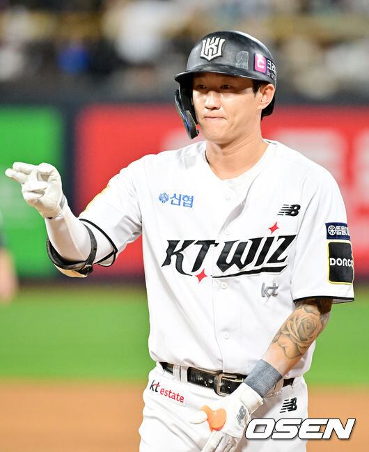 [OSEN=수원, 민경훈 기자] 28일 오후 수원 KT위즈파크에서 ‘2024 신한 SOL BANK KBO리그’ KT 위즈와 키움 히어로즈의 경기가 진행됐다.이날 홈팀 KT는 벤자민을, 키움은 조영건을 선발투수로 내세웠다.6회말 2사 주자 2루 KT 김민혁이 좌익수 앞 1타점 적시타를 때린 후 1루에서 기뻐하고 있다. 2024.09.28 / rumi@osen