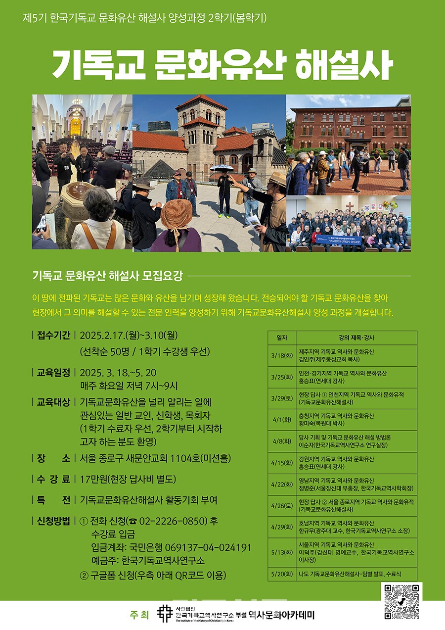 제5기 기독교 문화유산 해설사 양성과정 2학기(봄학기) 접수 기간은 3월 10일까지이며, 한국기독교 문화유산에 관심 있는 목회자·신학생·일반인은 누구나 참여가 가능하다.(문의 및 신청:02-2226-0850)