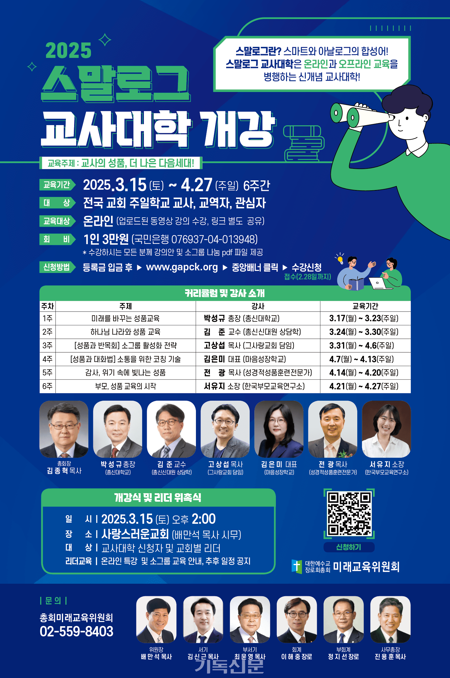 총회 미래교육위원회(위원장:배만석 목사, 이하 미래교육위)가 ‘2025 스말로그 교사대학’을 실시한다. ‘교사의 성품, 더 나은 다음세대!’를 주제로 열리는 이번 교사대학은 3월 15일부터 4월 27일까지 6주간 온라인을 통해 진행된다.