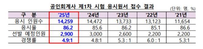 올해 공인회계사 제1차 시험의 경쟁률은 4.9대 1로 집계됐다. 지난해(4.8대 1)와 유사한 수준이다. 24일 금융감독원에 따르면 전날 실시된 제60회 공인회계사 제1차 시험에 총 1만4259명이 응시했고, 제1차 시험 선발 예정 인원은 2900명이다. 동점자로 인해 2900명을 초과하면 동점자를 모두 합격 처리한다. 응시자 수는 전년 대비 1.5% 감소