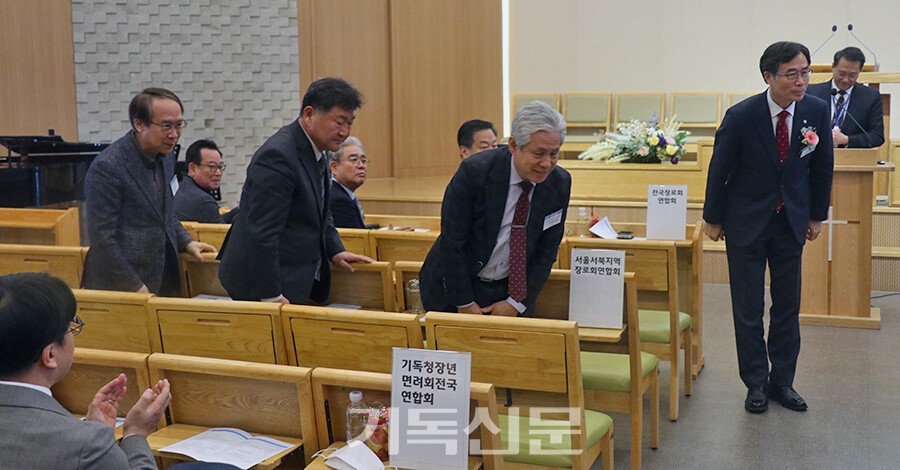 간담회에는 전국장로연합회 수석부회장이자 서울서북지역장로연합회 회장 이해중 장로와 임원, 전국여전도회연합회 회장 윤재순 권사와 임원, 기독청장년면려회 전국연합회 회장 전정하 장로와 임원, AP선교회 초대이사장 신신우 장로와 임원 등 30여 명이 참석했다.