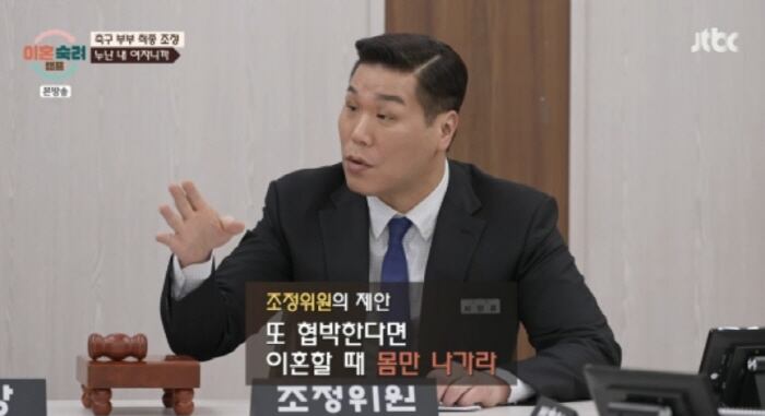 [스포츠조선 백지은 기자] 축구 부부의 최종 조정이 공개됐다. 20일 방송된 JTBC ‘이혼숙려캠프’에서는 남편이 11년간 프로 축구선수로 생활하며 벌었던 연봉을 가로챈 시부모님 때문에 갈등을 빚고 있는 축구 부부의 이야기가 그려졌다. 남편은 아내와 갈등을 빚고 있는 가운데에도 원가족에 대한 끈을 놓지 못했다. 박민철 변호사는 “부모님이 돈이 없다고 하지만