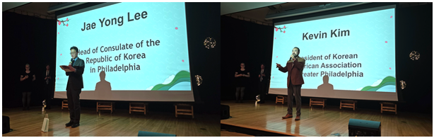 사진 왼쪽 (축사를 하고 있는 뉴욕 총영사관 필라델피아 출장소 이재용 소장) 사진 오른쪽 (축사를 하고 있는 김경택 필라델피아 한인회 회장)