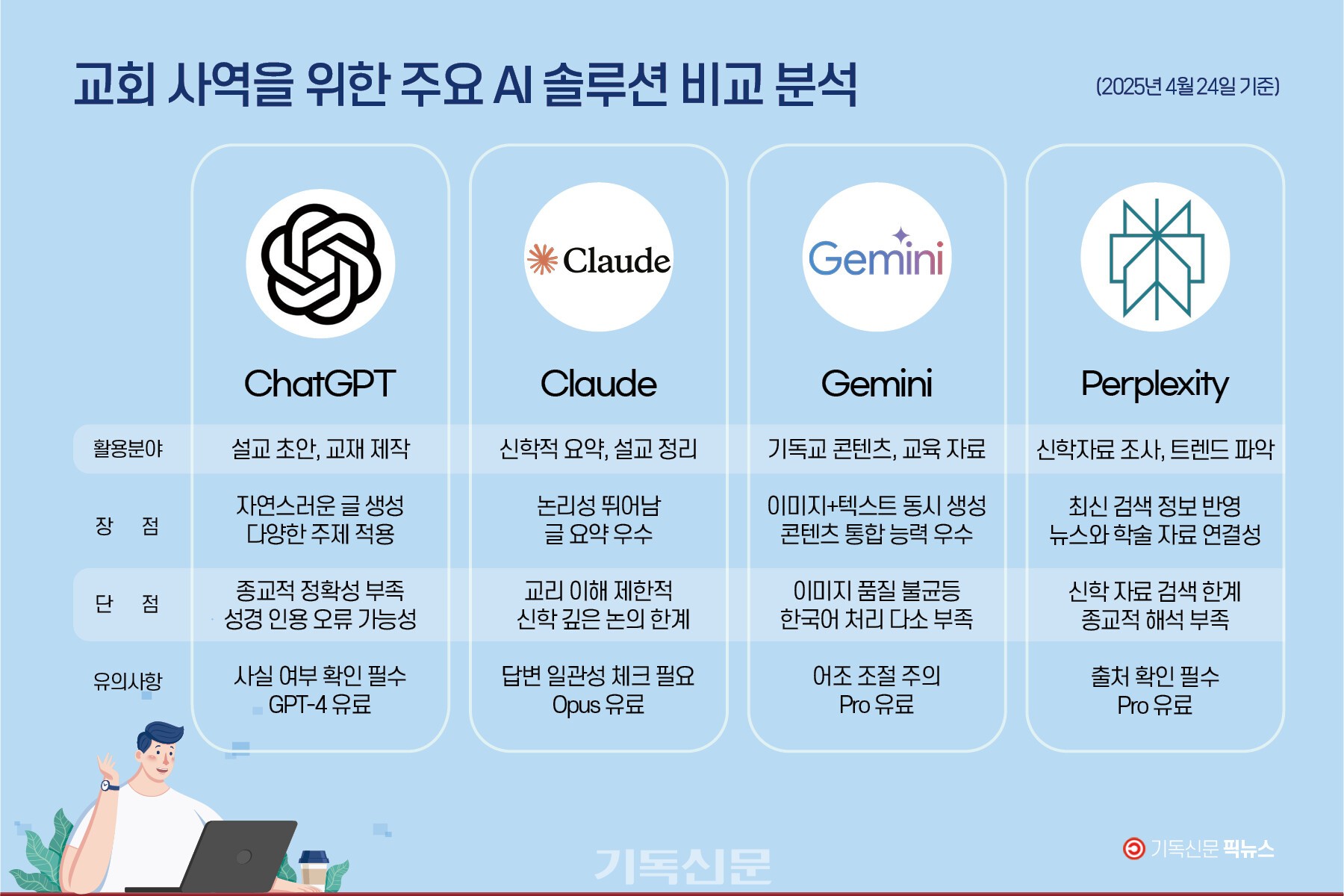 반면 클로드의 지식은 2024년 10월까지로 제한돼 있어 최신 정보나 사건에 대해서는 취약하고, 신학적 정확성은 목회자가 직접 확인해야 합니다.