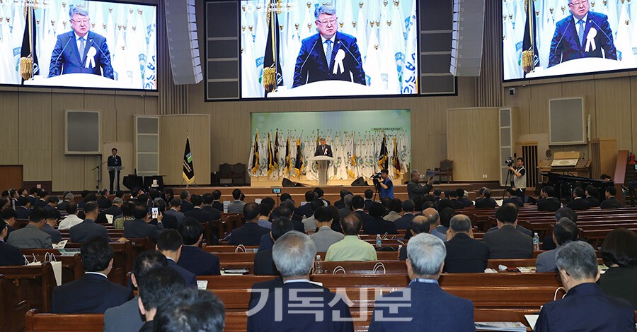 김종혁 목사는 ‘십자가, 다시 복음 앞에’란 제목으로 대회사를 했다. 김 목사는 “전국목사장로기도회는 우리 총회의 기도역사이며 민족 복음화와 총회 정체성을 지켜온 금자탑”이라며, 이제까지 총회는 목사장로기도회를 통해 “시대의 격랑과 위기 속에서 무릎 꿇기를 멈추지 않았고 주 앞에 엎드려 기도했다”고 되새겼다. 하지만 김 목사는 오늘 총회와 교회가 복음의 본질을 놓치고 있음을, 십자가를 삶으로 살아내지 못하고 있음을 회개하며 “오늘 이 기도회는 저에게 회개의 자리, 애통의 시간, 눈물의 강단이다. 전국목사장로기도회를 통해 우리 총회가 십자가 앞에 다시 서고, 전국 교회가 복음 앞에 다시 무릎 꿇기를 간절히 소망한다”고 밝혔다.
