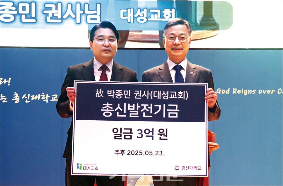 서울 공항동 대성교회(전태균 목사)를 섬기다 지난해 5월 27일 소천한 고 박종민 권사 유가족들이 고인의 유언에 따라 총신대학교(총장:박성규 목사)에 발전기금 3억원을 전달했다. 유가족들과 전태균 담임목사는 5월 23일 총신대 사당캠퍼스 채플에 참석해 함께 예배하고, 총신발전기금 3억원을 전달했다. 총신대에 거액의 유산을 기부한 사례는 이번이 처음이다.
