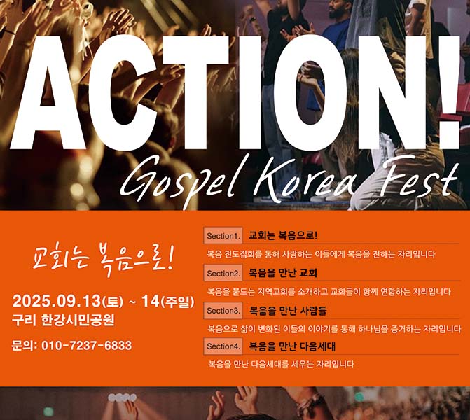 복음으로 하나 되어 도시 선교의 새 물결을 일으킬 ‘Action! Gospel Korea Fest 2025’ 대회가 오는 9월 13-14일 구리 한강시민공원에서 개최된다.
