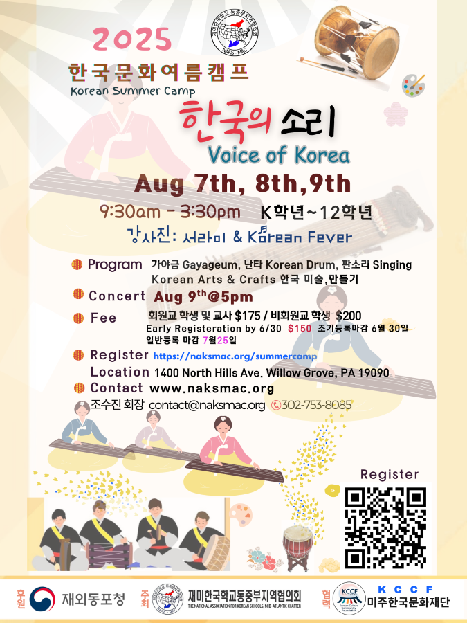 2025년 제11회 한국문화여름캠프 “한국의 소리”를 아래와 같이 개최함을 알려드립니다. 최고의 강사진과 다양한 프로그램으로 준비하는 이번 여름문화캠프에 각 학교에서 많은 학생들이 참여할 수 있도록 독려해 주시기 바랍니다.