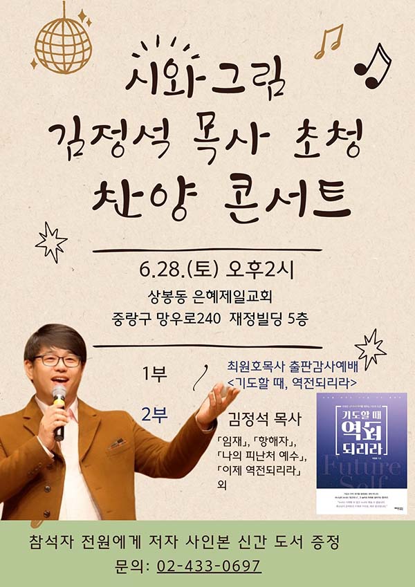 2부에서는 책을 쓴 계기가 된 찬양 ‘이제 역전되리라’를 부른 ‘시와그림’ 김정석 목사 초청 찬양 콘서트로 진행된다. 시와그림은 ‘이제 역전되리라’ 외에도 ‘임재’, ‘항해자’, ‘나의 피난처 예수’ 등의 곡으로 잘 알려져 있다.