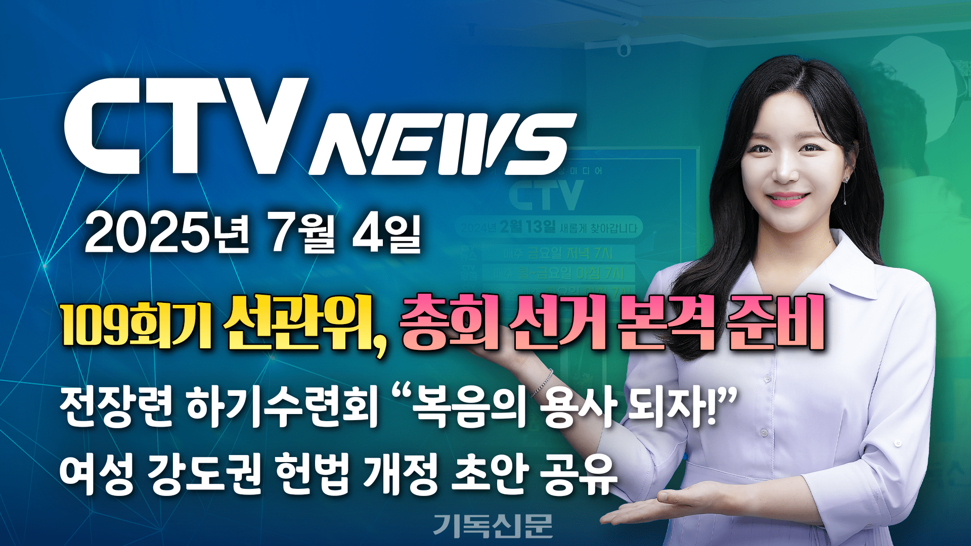 교단 안팎의 주요 이슈를 엄선한 CTV 뉴스! 여러분의 삶에 유익한 좌표가 될 것입니다.00:45 [KEYWORD1] 여성 강도사 헌법 개정안 논의02:39 [KEYWORD2] 전국장로회연합회 하기 부부수련회05:50 [KEYWORD3] 109회기 총회 선거관리위원회, 올해도 ‘선거 방송’ 실시!