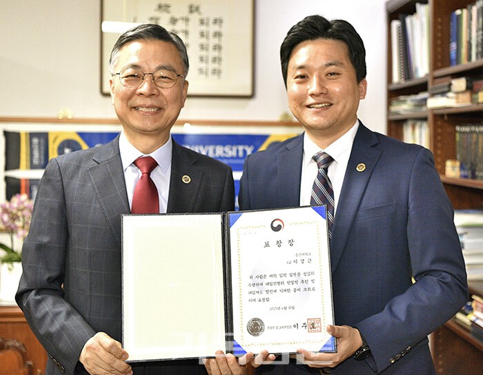 총신대학교(총장:박성규) 입학인재개발팀 이경근 직원이 ‘2025학년도 수능 및 대입 업무 유공자’로 선정되어 부총리 겸 교육부장관 표창을 수상했다. 총신대 박성규 총장은 7월 9일 총장실에서 이경근 직원에게 표창장을 대신 전달하고 이경근 직원의 공로를 치하했다.