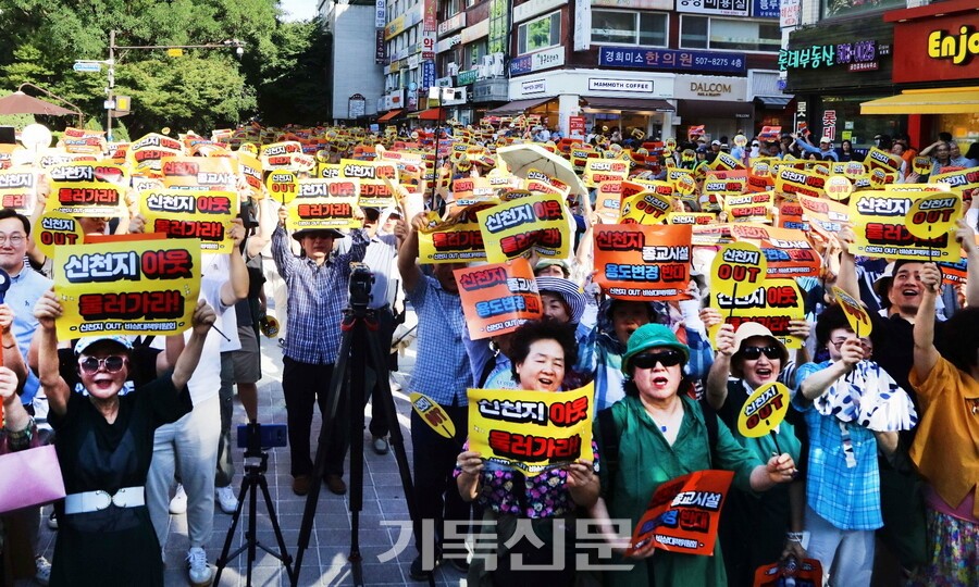 시민단체들로 구성된 ‘신천지 OUT 비상대책위원회’(이하 비대위)는 12일 과천 중앙공원과 시청 일대에서 신천지 종교시설 용도변경 반대 집회를 개최했다. 참석자들은 신천지증거장막성전(이하 신천지) 도심 내 종교시설 용도변경은 “지역사회의 안전과 신뢰, 공동체의 존립에 관한 문제”라고 강조했다.