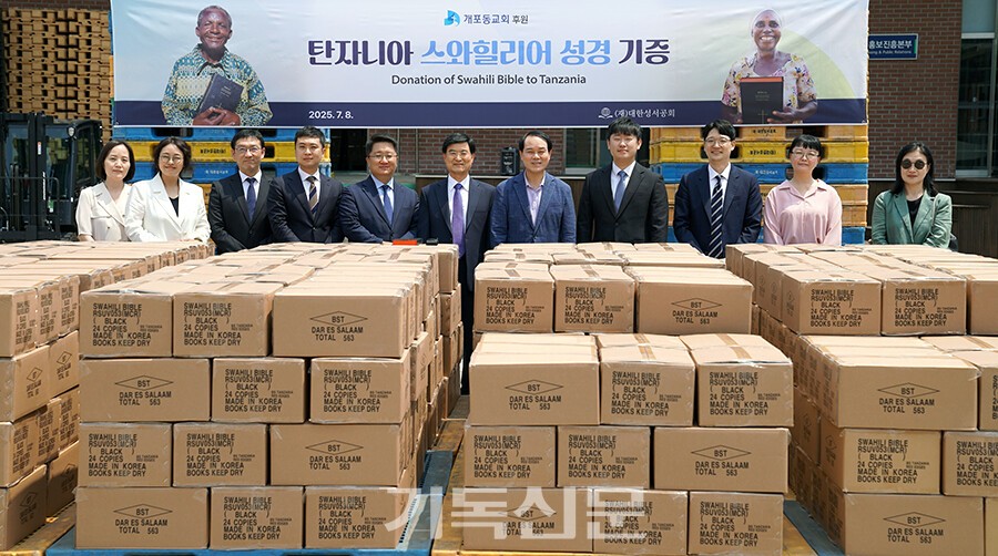 대한성서공회(이사장:이선균 목사)는 7월 8일 경기 용인시 반포센터에서 개포동교회 성도들이 참여한 가운데, 탄자니아에 <스와힐리어 성경> 5643부를 보내는 기증 예식을 가졌다.