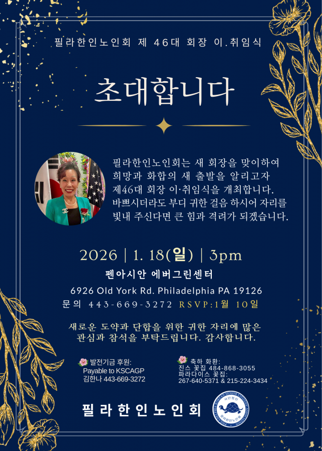 필라한인노인회는 새 회장을 맞이하여 희망과 화합의 새 출발을 알리고자 제46대 회장 이·취임식을 개최합니다.